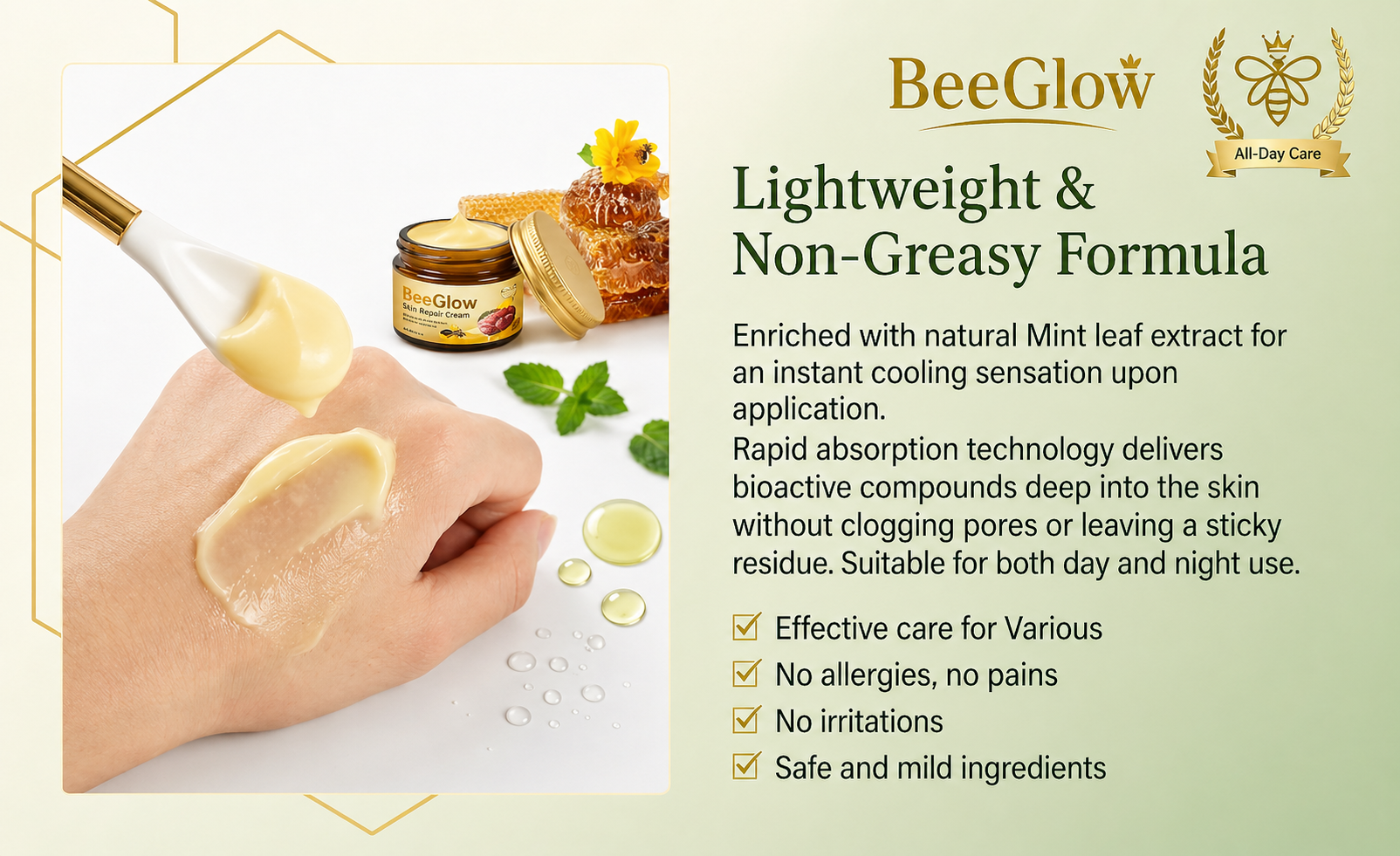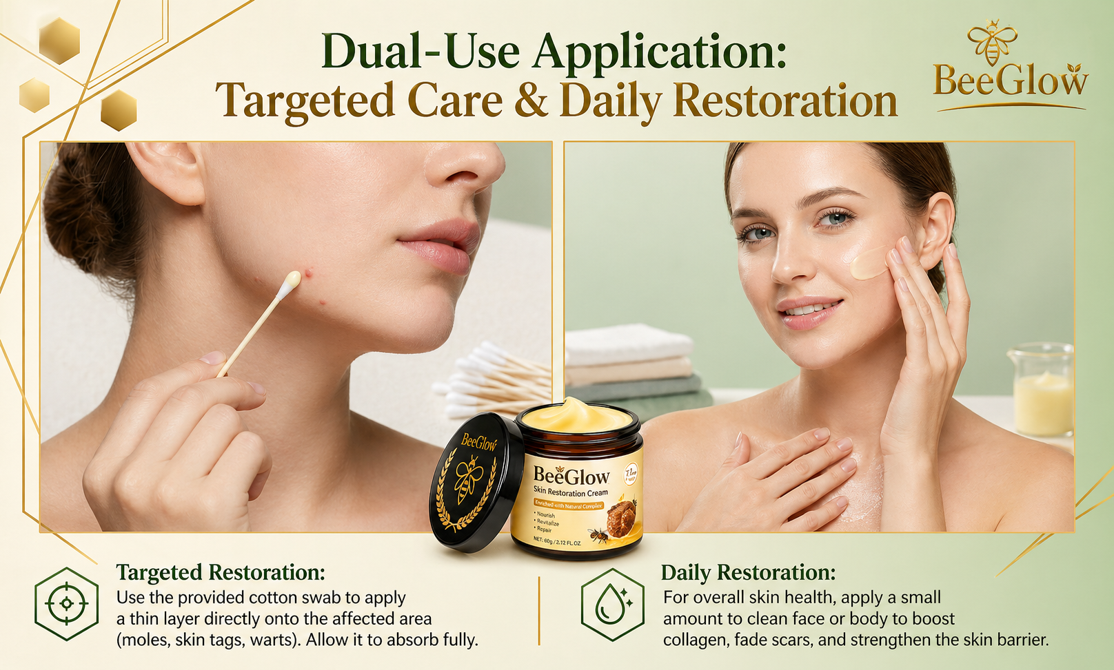 BeeGlow Skin Repair Cream is designed to help improve the appearance of uneven skin, dryness, and rough texture while keeping your skin soft, hydrated, and radiant every day.