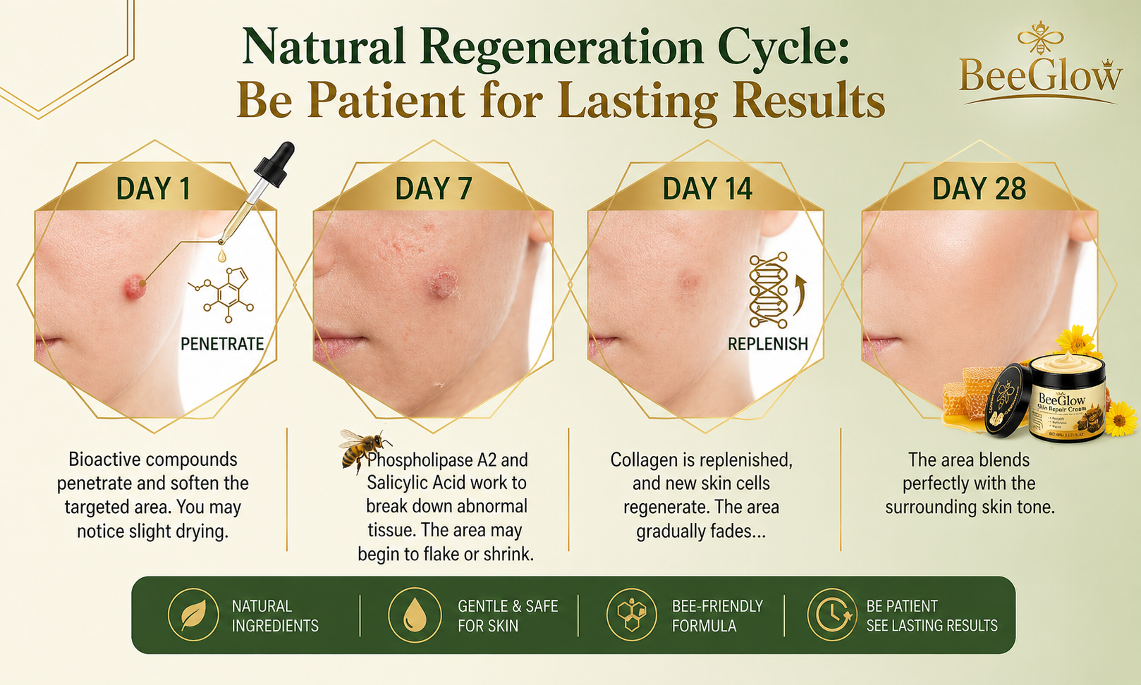 With consistent use, BeeGlow helps improve the look of uneven skin tone, visible spots, and rough areas — leaving your skin looking smoother and more balanced.